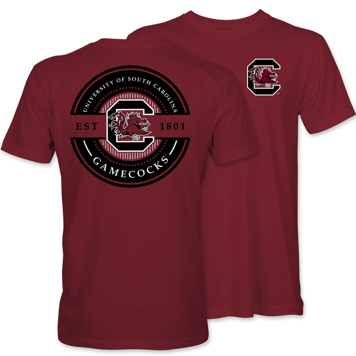 Rep your Carolina pride with timeless style in our "Gamecocks Seersucker Circle" tee. Featuring the University of South Carolina’s iconic logo wrapped in a bold circle design with subtle seersucker texture, this shirt is the perfect blend of Southern tradition and Gamecock spirit. Printed on a garnet tee, it's made for Saturdays in Columbia and beyond.