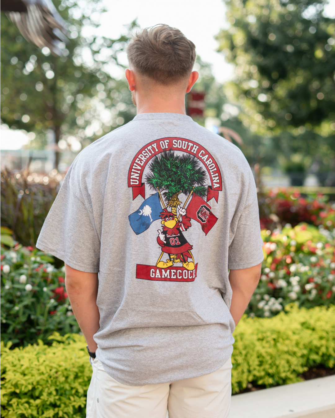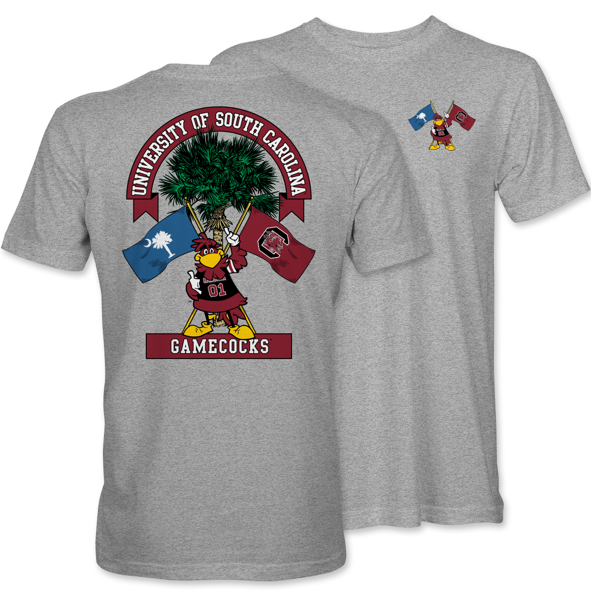 Celebrate the pride of South Carolina with our “Cocky Crossflags” tee. Featuring the beloved Cocky standing tall beneath a palmetto tree, waving the state and Gamecocks flags with pride, this shirt is a true symbol of state and school spirit. Printed on a light steel tee, it’s perfect for fans who bleed garnet and black.