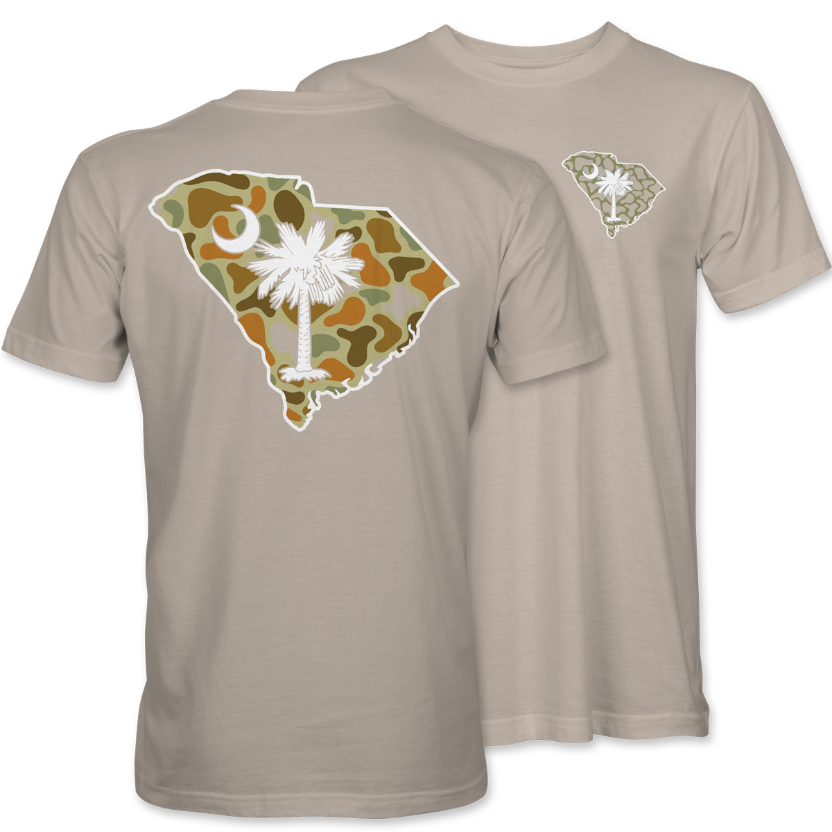 Rep your roots with a camo twist. This design frames the iconic crescent & palmetto inside a South Carolina outline filled with duck camo, plus a matching mini at left chest. Printed on a soft sand-colored tee—great for tailgates, camp mornings, and every day in SC.