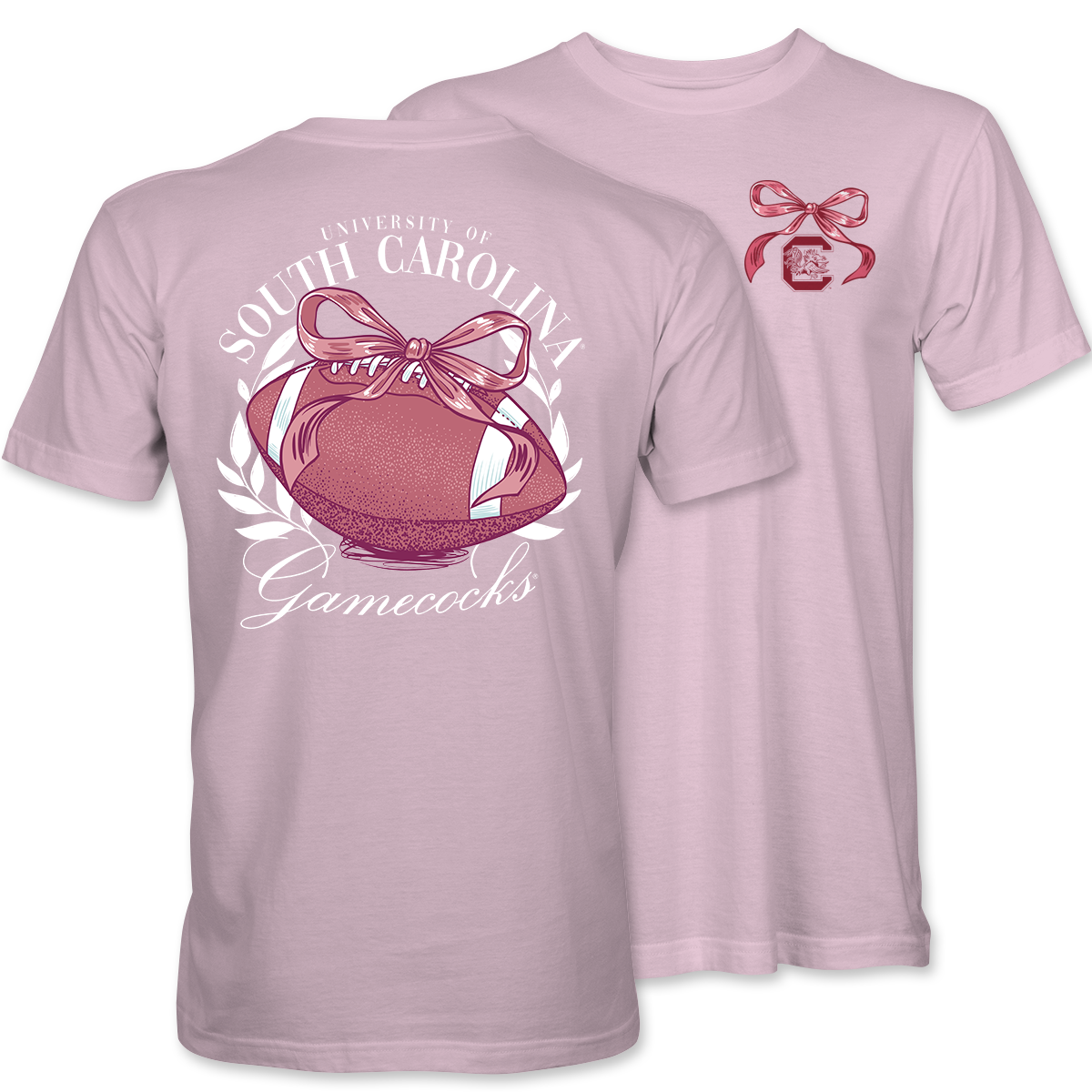 Show your team spirit with a feminine twist in our "Gamecocks Football Bow" tee. Featuring a hand-drawn football wrapped in a ribbon bow and the official University of South Carolina logo, this design celebrates your love for Gamecock football in style. Printed on a soft light pink tee, it's the perfect blend of Southern charm and school pride.