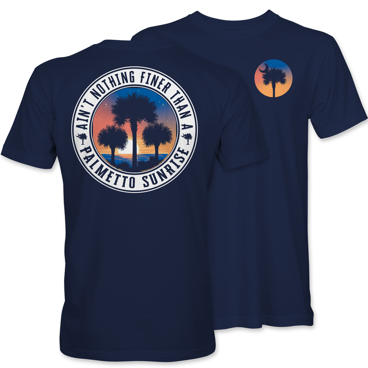 Nothing beats a Lowcountry morning. This “Palmetto Sunrise” tee captures palms against a rising sun within a circular badge, with a coordinating left-chest graphic. Printed on a soft navy tee—ideal for beach trips, boat days, or sunsets on the porch.