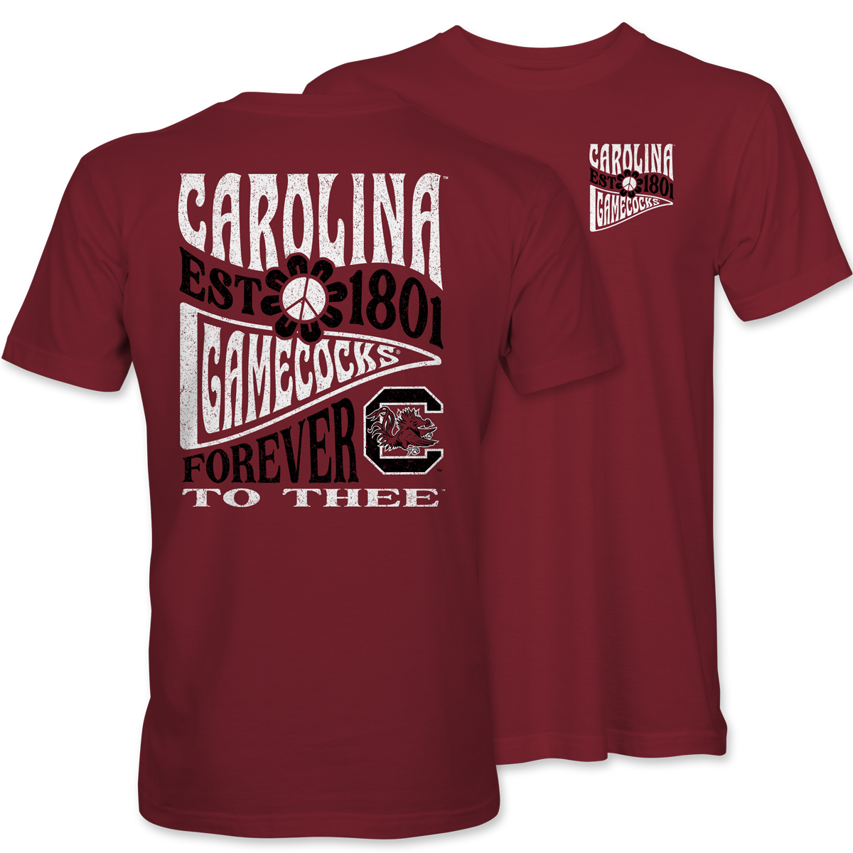 graphics, a peace sign flower, and spirited pennants waving proudly with the University of South Carolina logo, this shirt is all about tradition with a groovy twist. Printed on a soft garnet tee, it's perfect for game day or casual wear that reps your school with heart.