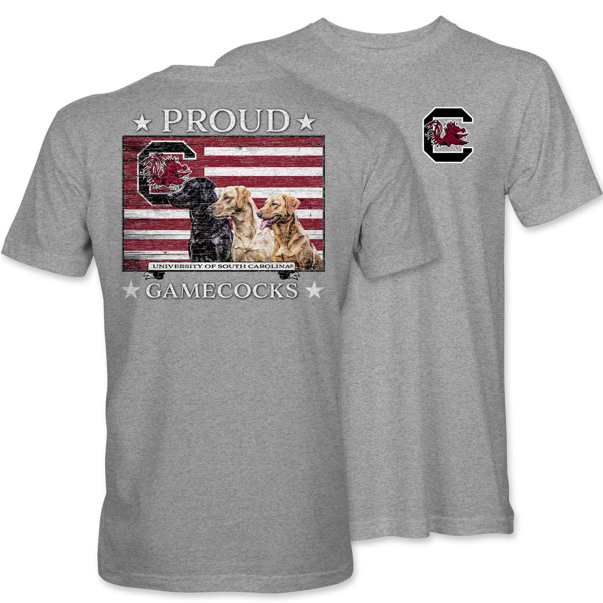 Celebrate loyalty, pride, and man’s best friend with our "Proud Gamecocks Labs" tee. Featuring a patriotic design with three labrador retrievers in front of the American flag and the iconic University of South Carolina logo, this shirt is perfect for dog lovers and die-hard fans alike. Printed on a soft light steel tee, it’s ideal for tailgates, campus strolls, or cheering on the Gamecocks at home.